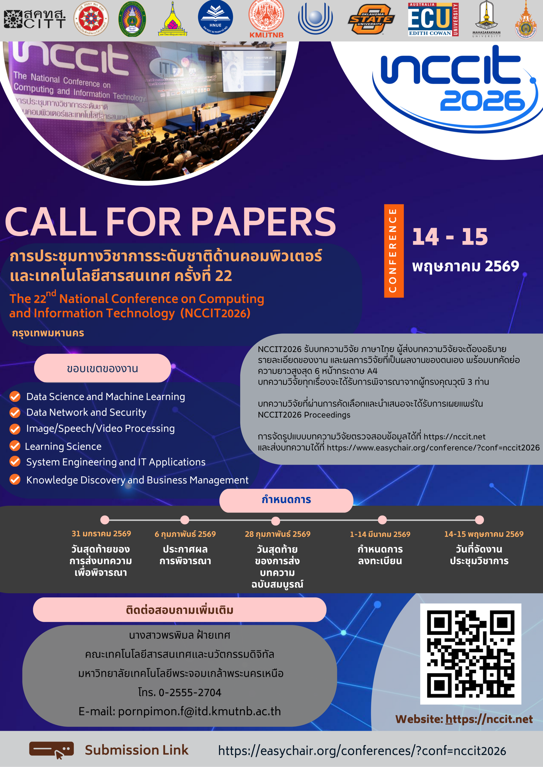 Download NCCIT2026 Call for Paper, (image) รูปแบบบทความ (Thai Version) Word, PDF บทคัดย่อ (Abstract) Word, PDF ตัวอย่างบทความฉบับสมบูรณ์ (Camera Ready Version) เอกสารแสดงลิขสิทธิ์ (Copyright) Word, PDF Proceedings of NCCIT 2025 2024 2024 (Abstract) 2023 2022 2021 2020 2019 2018 2017 2016 2015 2014 2013